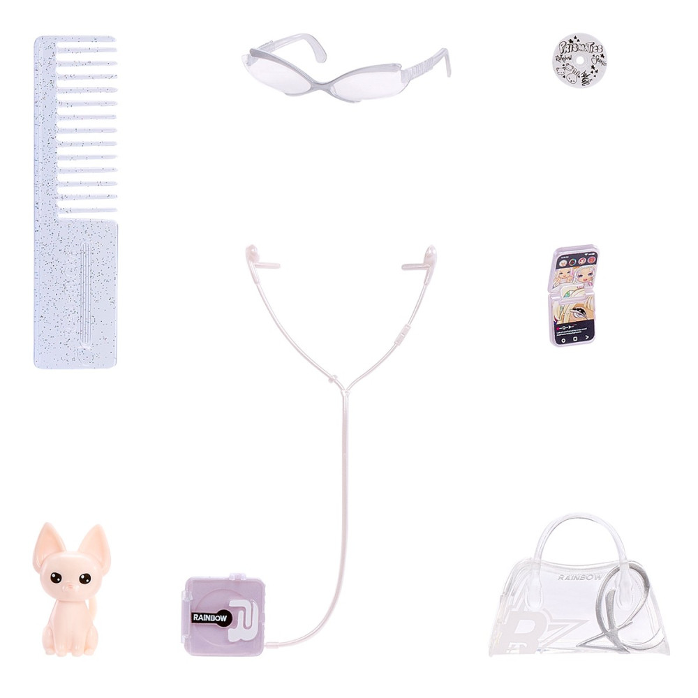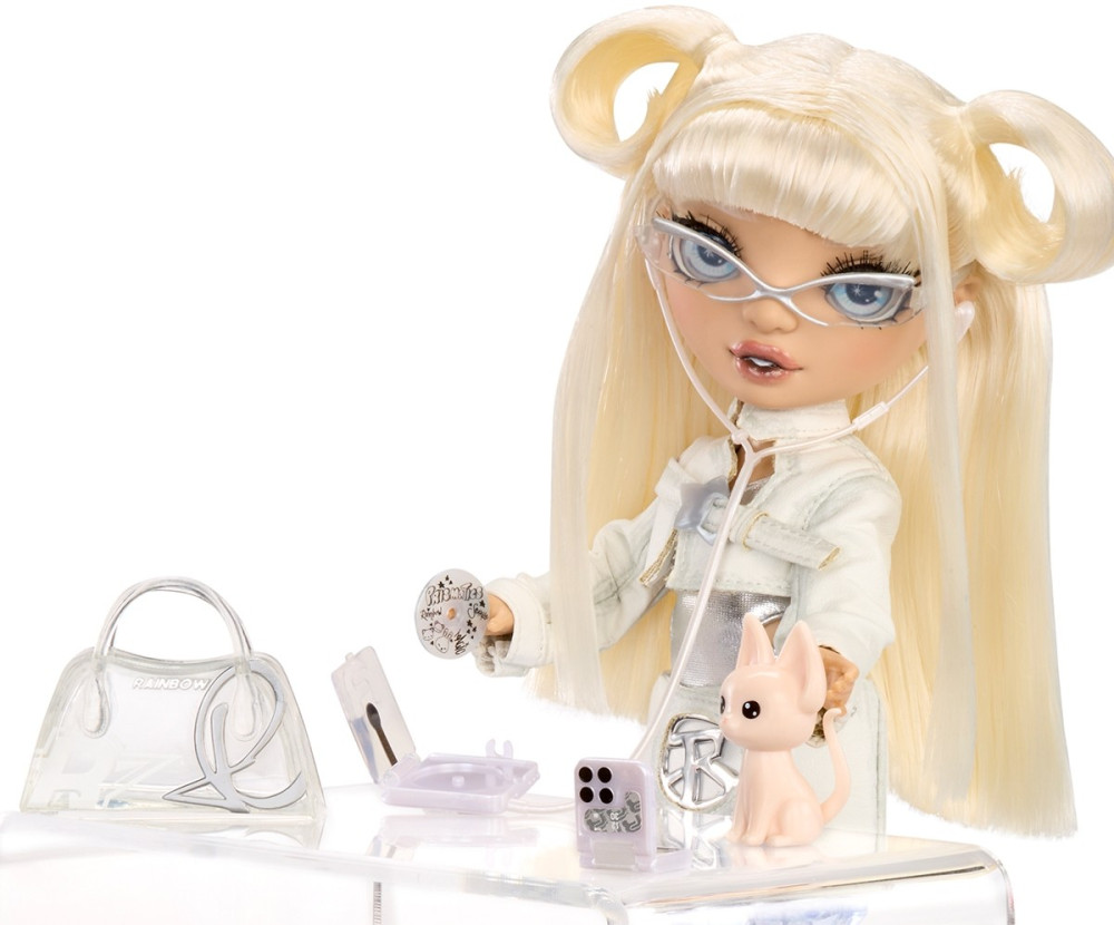 У комплекті з лялькою - сумочка домашній улюбленець ляльки гребінець, окуляри, розкладний телефон, CD-плеєр та дротові навушники + CD,