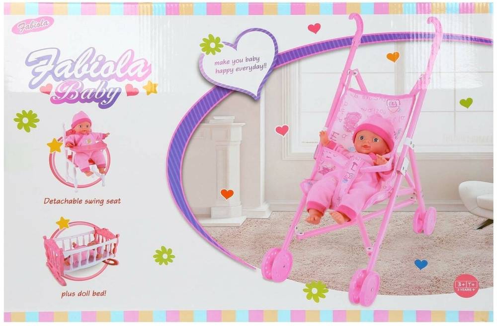 У комплекті з лялькою - коляска, стільчик для годування, ліжечко,