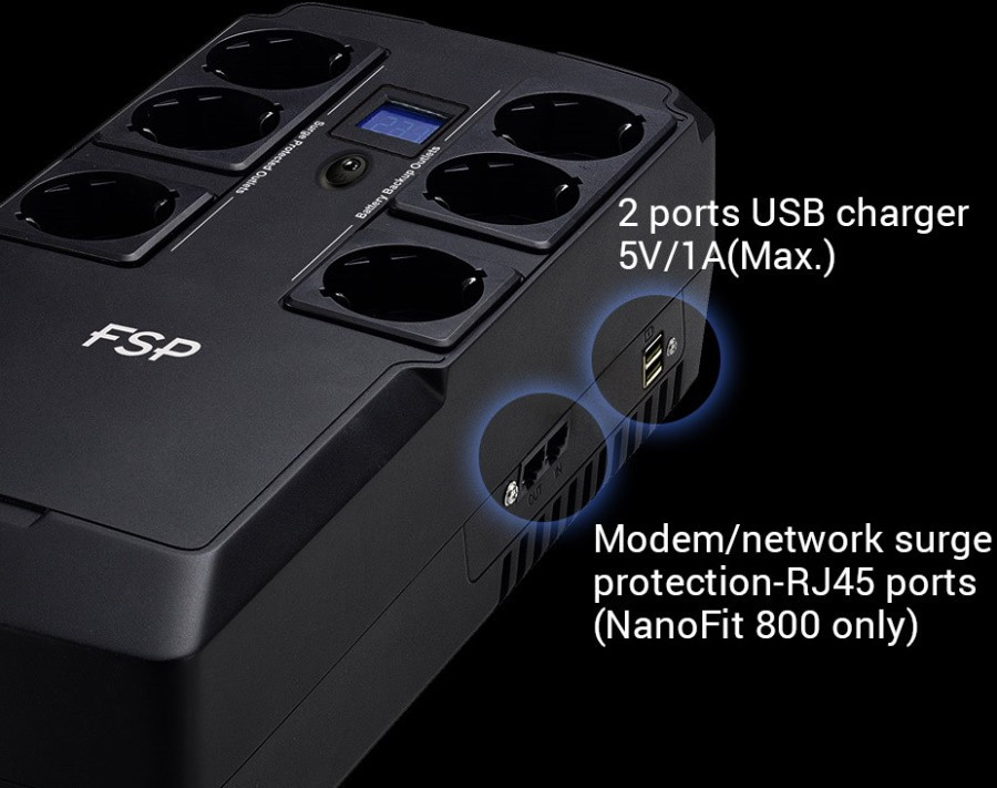 ДБЖ FSP NanoFit 800, 800ВА480Вт, SCHUKO, USB2хUSB зар 5V1A(Max.), AVR, RG11 (810833)