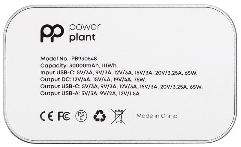 Батарея універсальна PowerPlant 30000mAh, PD76W, QC3.0, DC 12-19V, USB-C(65W Max), USB-A (PB930548)