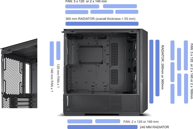 Місць для вентиляторів спереду - 2x160мм / 2x140мм, 3x120мм /,