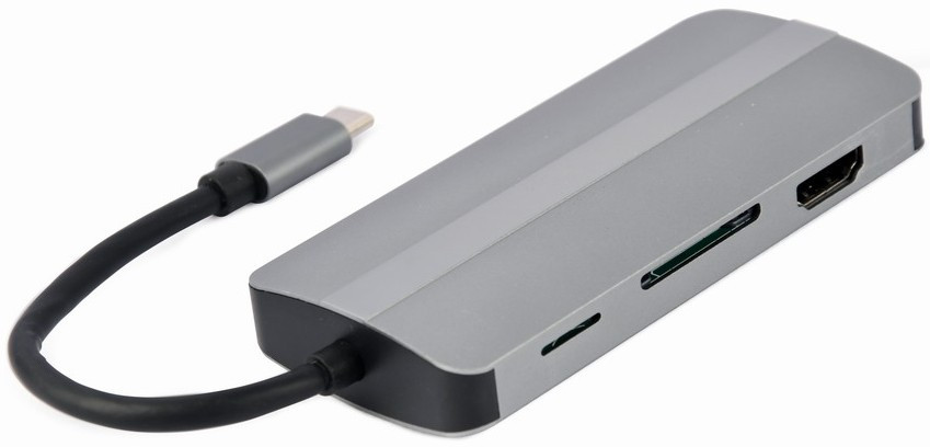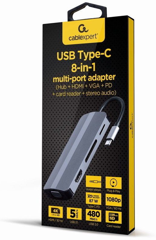 Адаптер Cablexpert A-CM-COMBO8-02, USB Type-C 8-в-1 (USB хаб 3.0HDMIVGAPDкартридерстерео-аудіо)