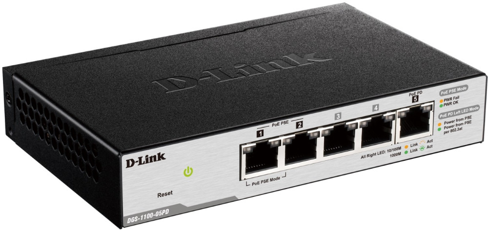 Комутатор D-Link DGS-1100-05PD 5xGE, (2xGE, 2xGE PoE, 1xGE PD), EasySmart