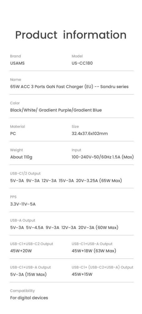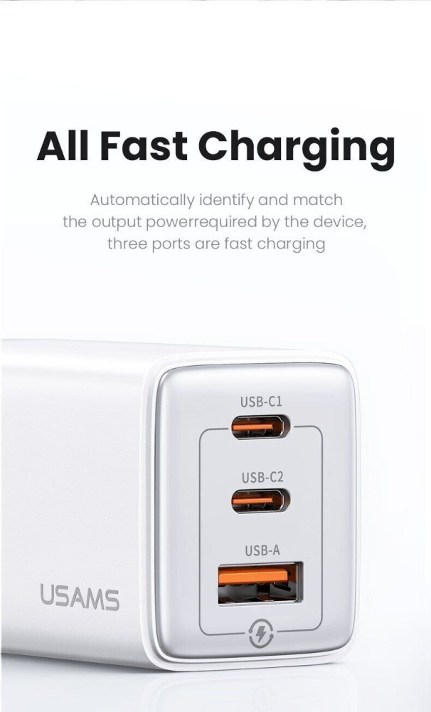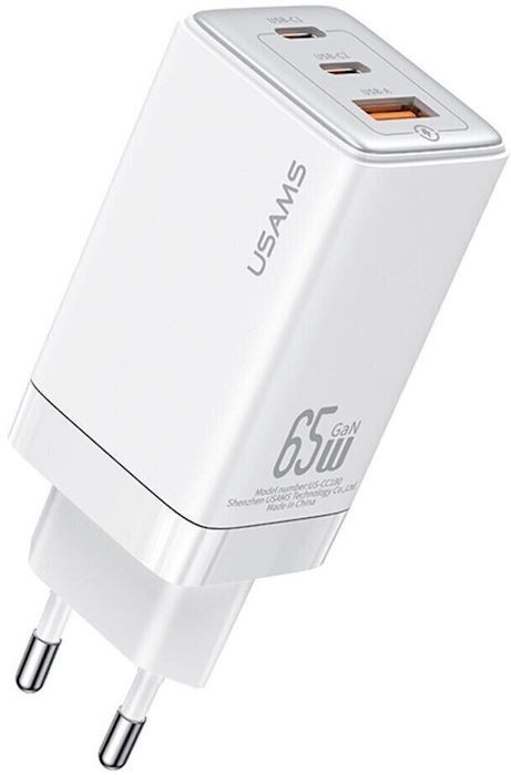 Зарядний пристрій 3 порти Usams US-CC180 triple GaN 1 A + 2C 65 W 5A біле