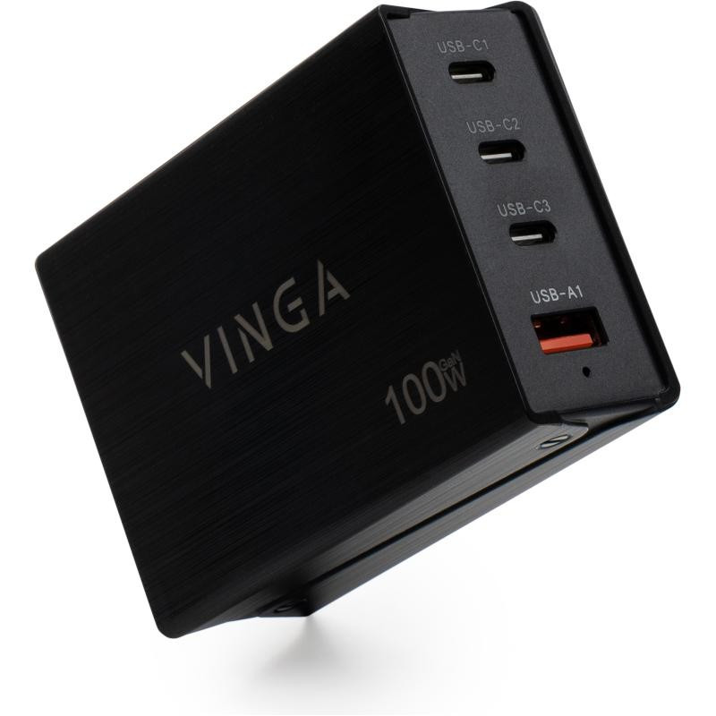 Зарядний пристрій Vinga GaN 100W PD+QC 3C1A ports 1.0m Wired Charger (VCPCH100CB)