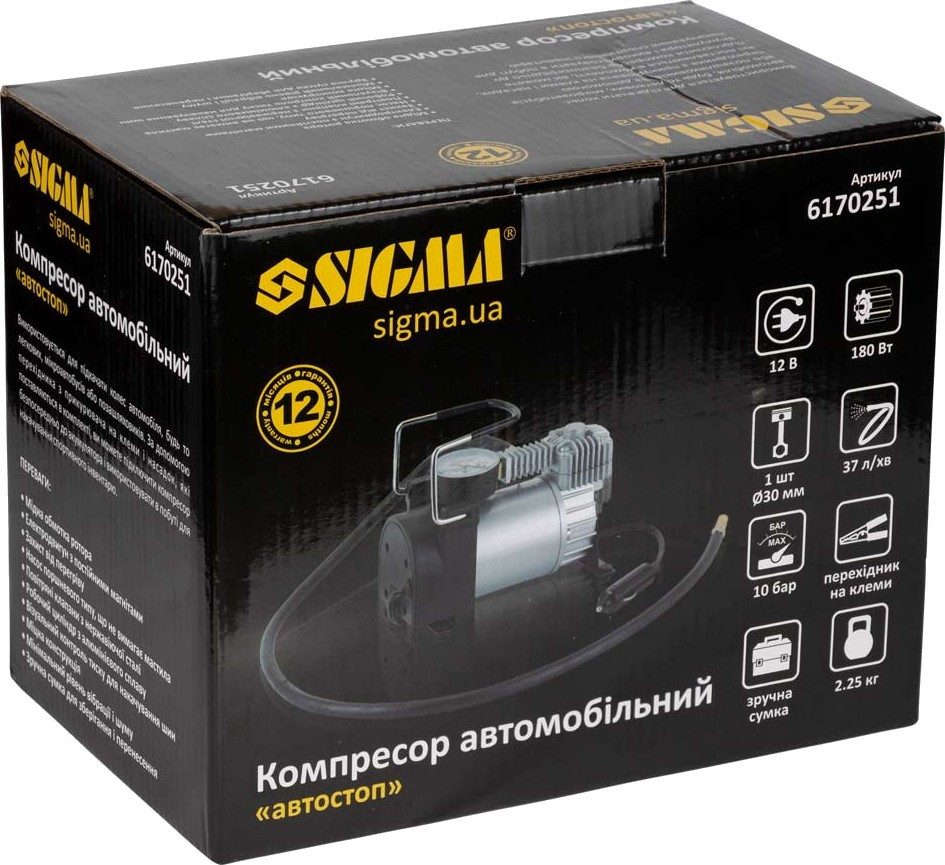 Автомобільний компресор Sigma 12В, 180Вт, 37лхв, 10бар (6170251)