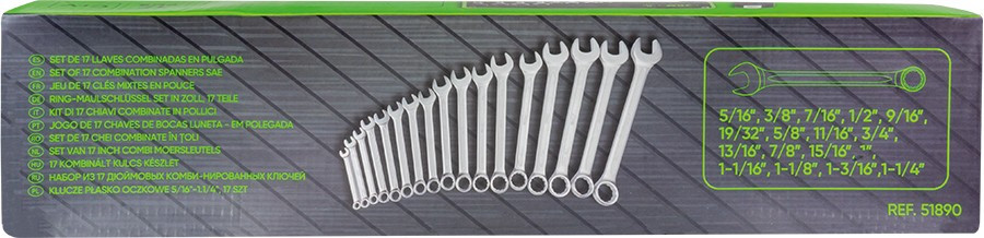 Розміри гайкових ключів - 5/16”, 3/8”, 7/16”, 1/2”, 9/16”, 19/32”, 5/8”, 11/16”, 3/4” мм / 13/16”, 7/8”, 15/16”, 1”, 1-1/16”, 1-1/8”, 1-3/16”, 1-1/4” /,
