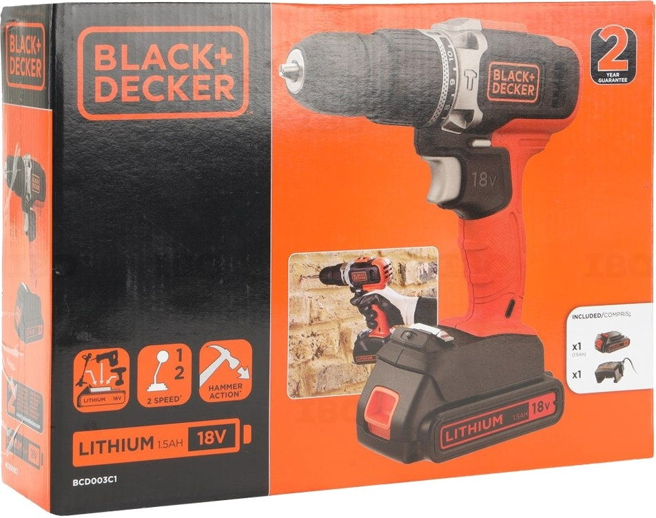 Шуруповерт BlackDecker 18 В, 1.5Ah, 45 Нм,0-3600-1400 обхв, 21000 удхв, 1.3 кг (BCD003C1)
