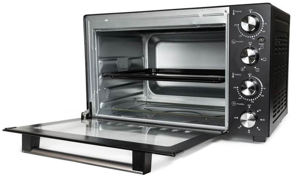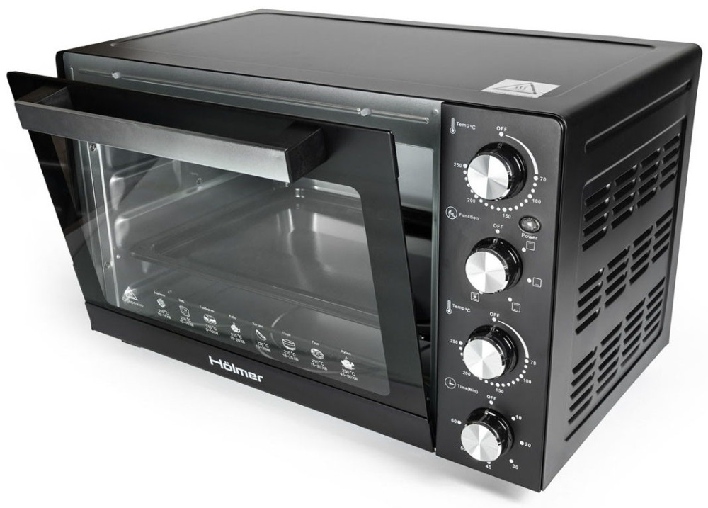 Електродуховка Holmer HEO-083C, Black, 1500W, 38л, 3 рівні, роздільне регулювання температури, таймер, конвекція, 70-250°С, деко з антипргарним покриттям, решітка гриль, ручка, вертель, фіксація відкритого положення дверцят