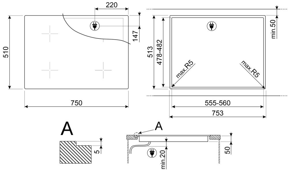 Розміри для монтажу (ШхГ) - 555x478 мм,