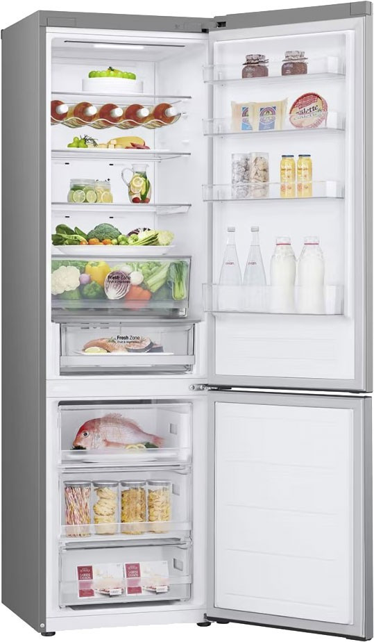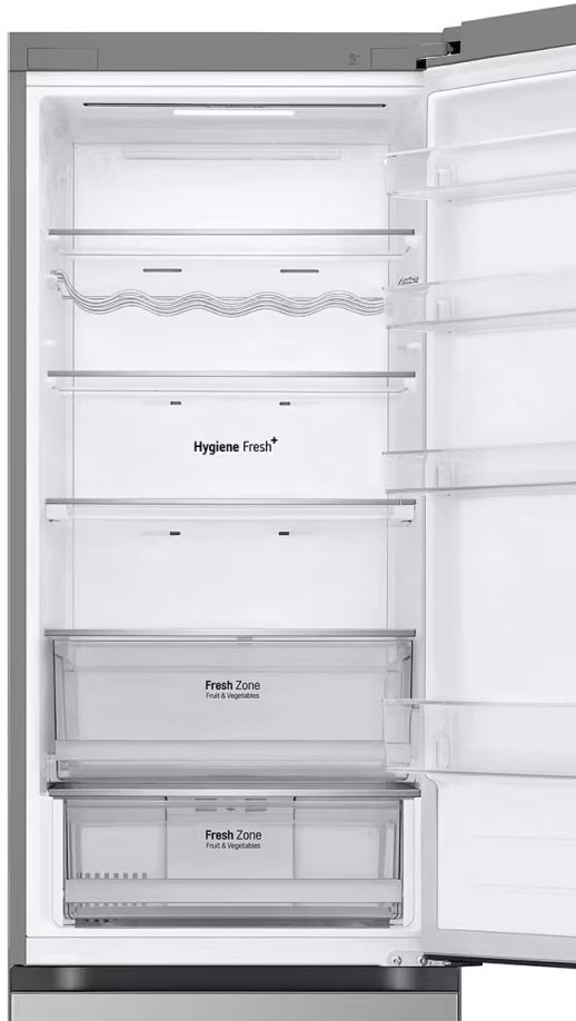 Холодильник LG з нижн. мороз., 203x60х68, холод.відд.-277л, мороз.відд.-110л, 2дв., А++, NF, інв., диспл зовн., зона св-ті, сріблястий