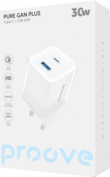 Мережевий зарядний пристрій Proove Pure GaN Plus 30W (Type-C + USB) White (WCPU30111202)