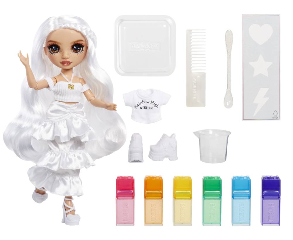 В комплекте с куклой - дополнительная одежда/обувь расческа, 6 цветных порошков, резинки для окрашивания в стиле тай-дай / губка для нанесения красок /,