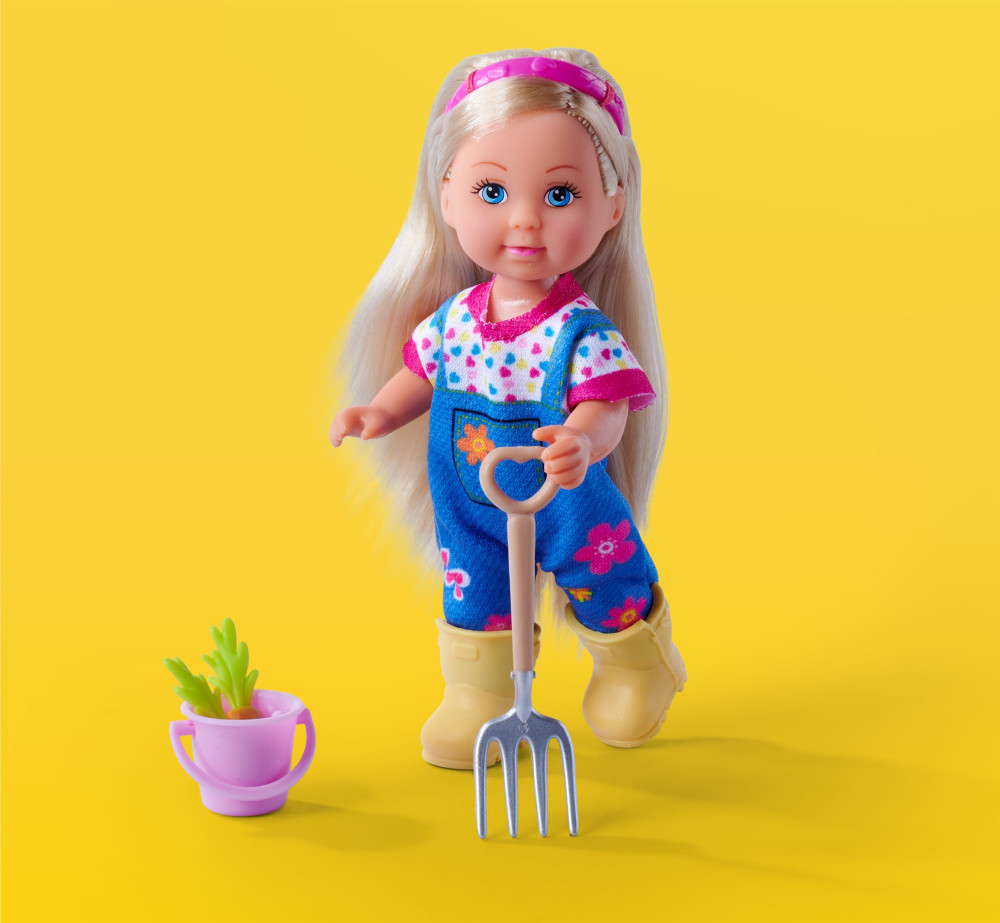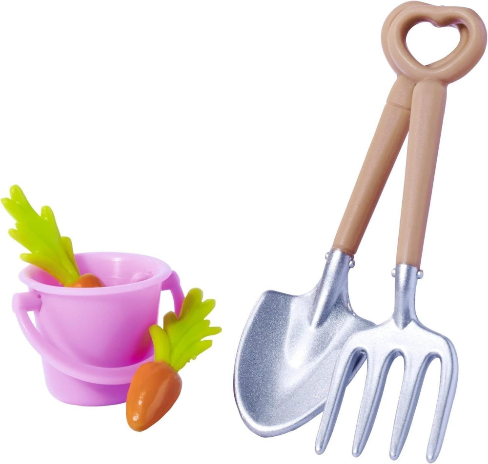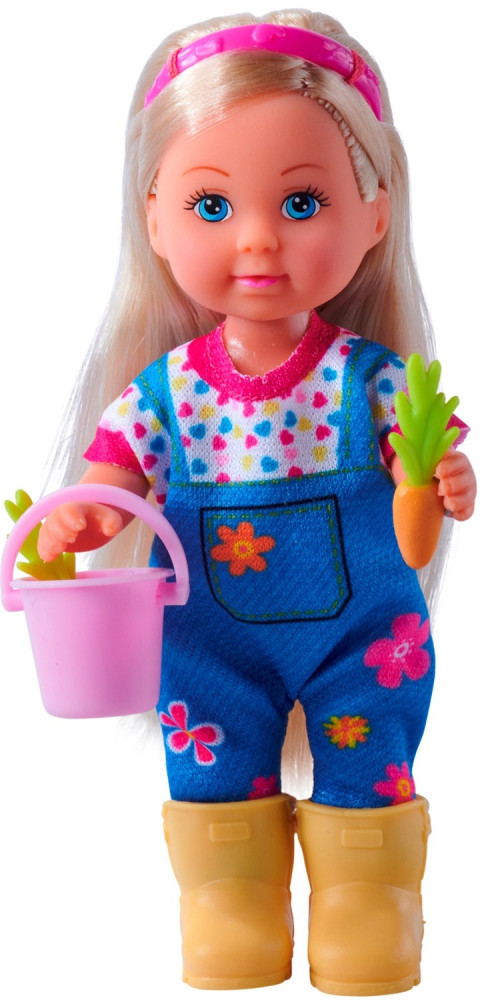 В комплекте с куклой - лопата, ведро, вила, 2 морковки,