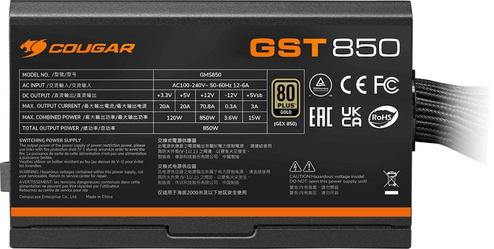 Блок живлення Cougar GST 750, 750 Вт, 80 Plus Gold, ATX 3.1, 120 мм HDB Fan, 6 SATA + 4 PCI-E