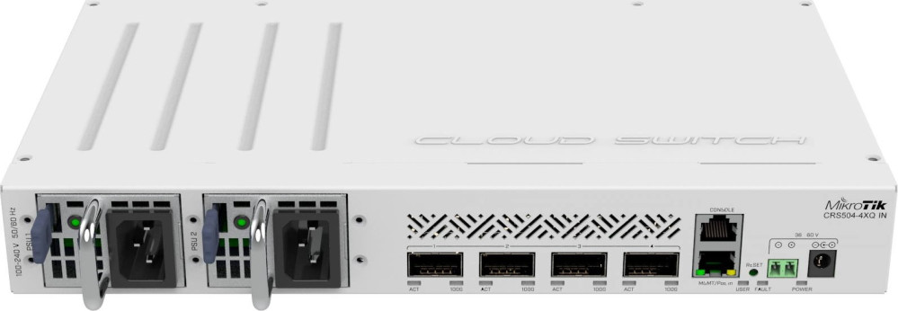 Коммутатор MikroTik CRS504-4XQ-IN (4x100G QSFP28 , 1xFE LAN, POE-IN, DC JACK, 2-PIN, Dual PSU)