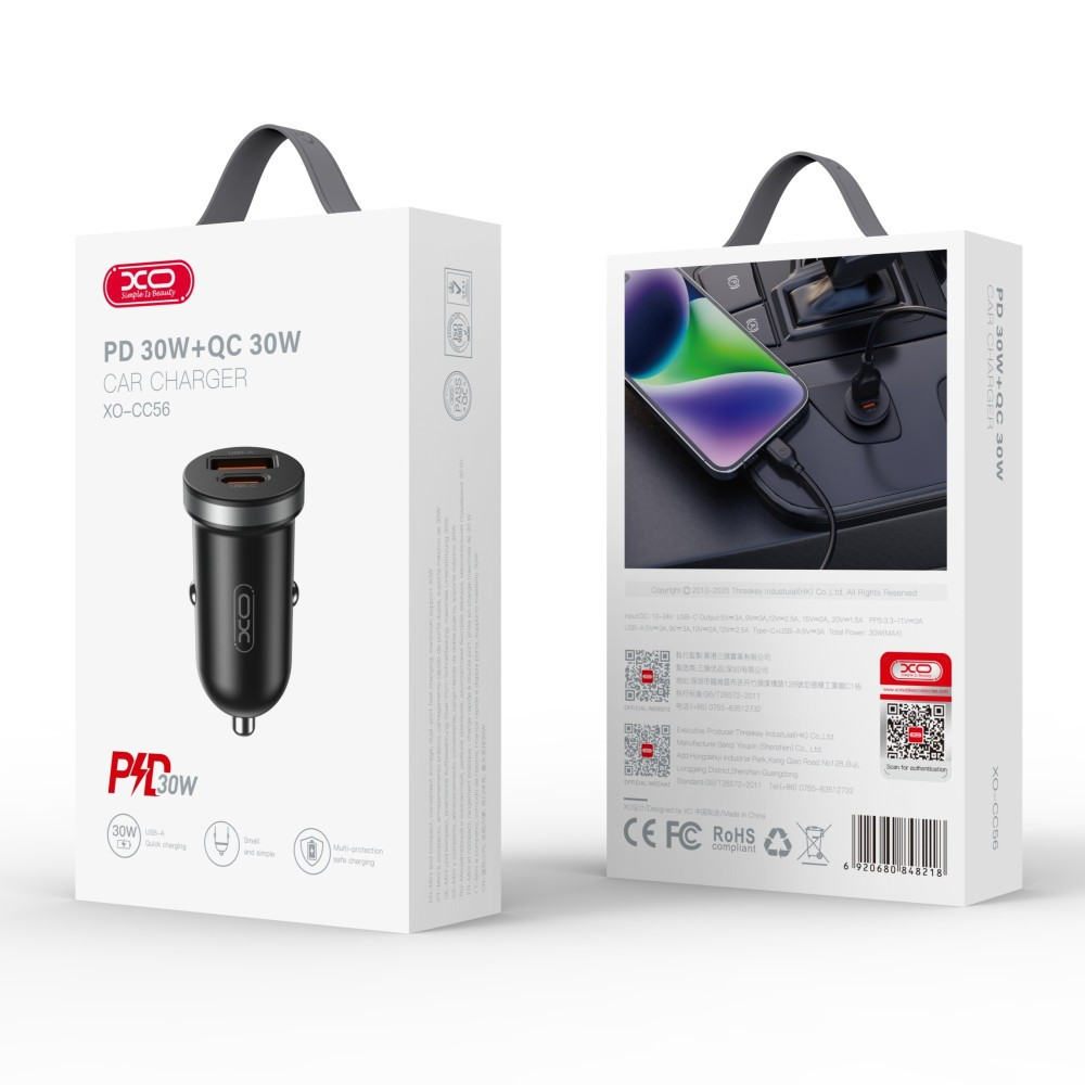 Авто зарядка XO CC56 30W Mini Car Charger Type-C PD + USB-A (Чорний)