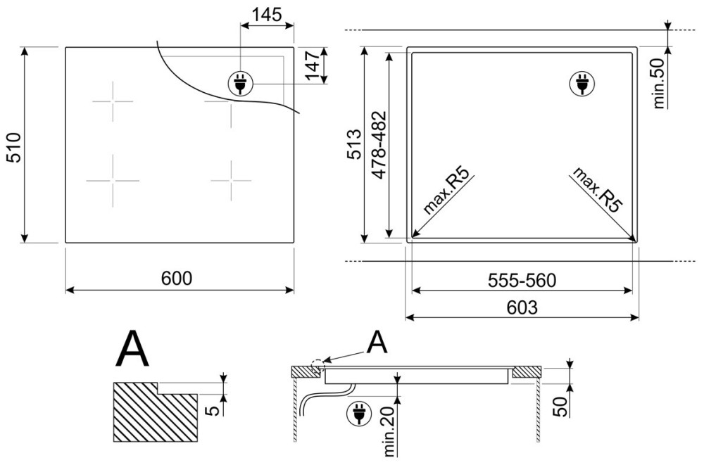 Размер для монтажа (ШхГ) - 555x478 мм,