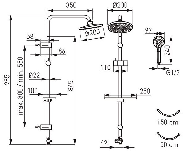 Длина шланга (ручной душ) - 150 см / второй: 50 см /,