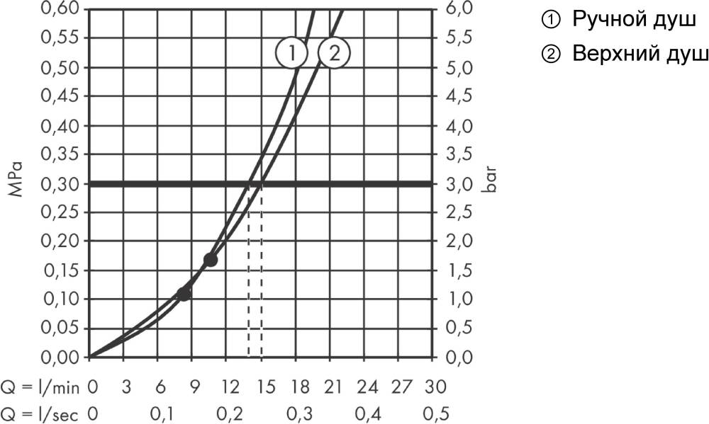 Расход воды (ручной душ) - 14 л/мин / при давлении воды 3 бар /,