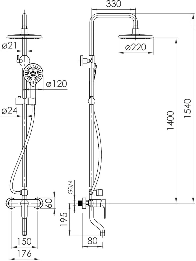 Размеры панели / стойки - 1540x330 мм,