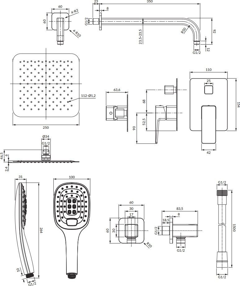 Форма верхнего душа - квадратная,