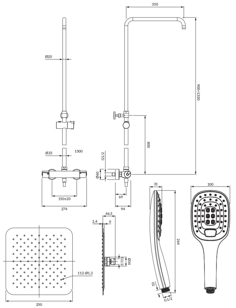 Размеры панели / стойки - 900-1330х350 мм,