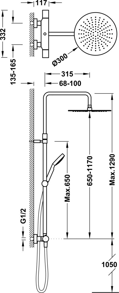 Размеры верхнего душа - 300 мм,