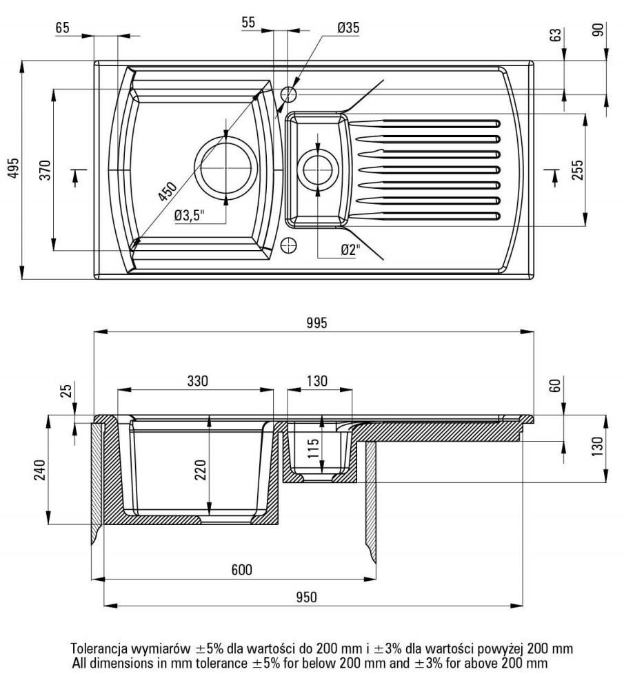 Диаметр отверстия под смеситель - 35 мм,