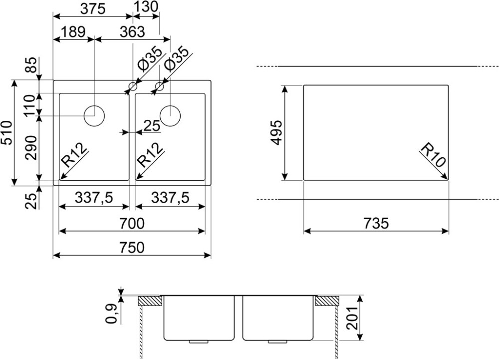 Диаметр отверстия под смеситель - 35 мм,