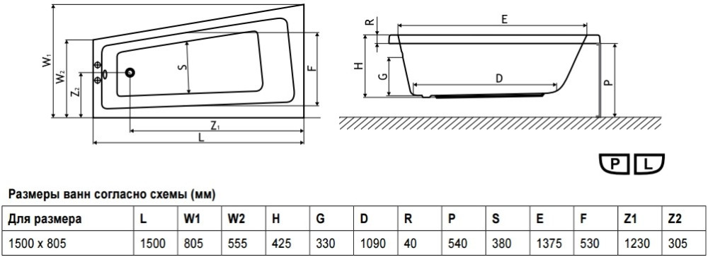 1500x805x425 мм