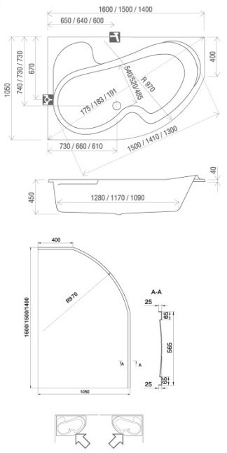 Глубина ванны - 450 мм,