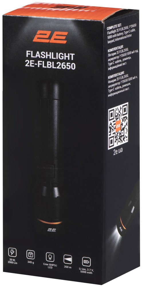 Ліхтар ручний акумуляторний 2E FLBL2650, USB-C, 5000мА•год, 2000лм, 20Вт, 5 функцій освітлення, IP44