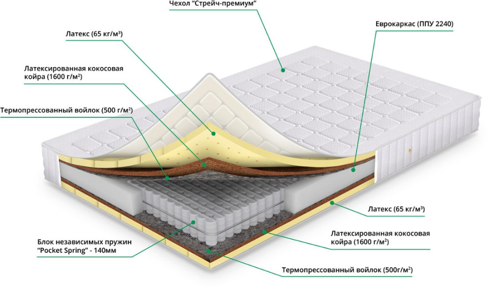 Наполнитель - латекс, латексированная кокосовая койра, термовойлок,