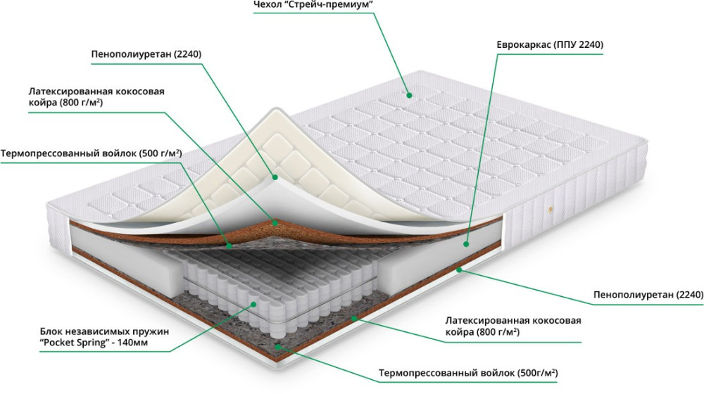 Наполнитель - пенополиуретан, латексированная кокосовая койра, термовойлок,