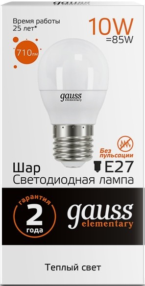 | Gauss LED ELEMENTARY G45 10W 3000K E27 53210 | 10 Вт | 3000 К | Сравнить цены |