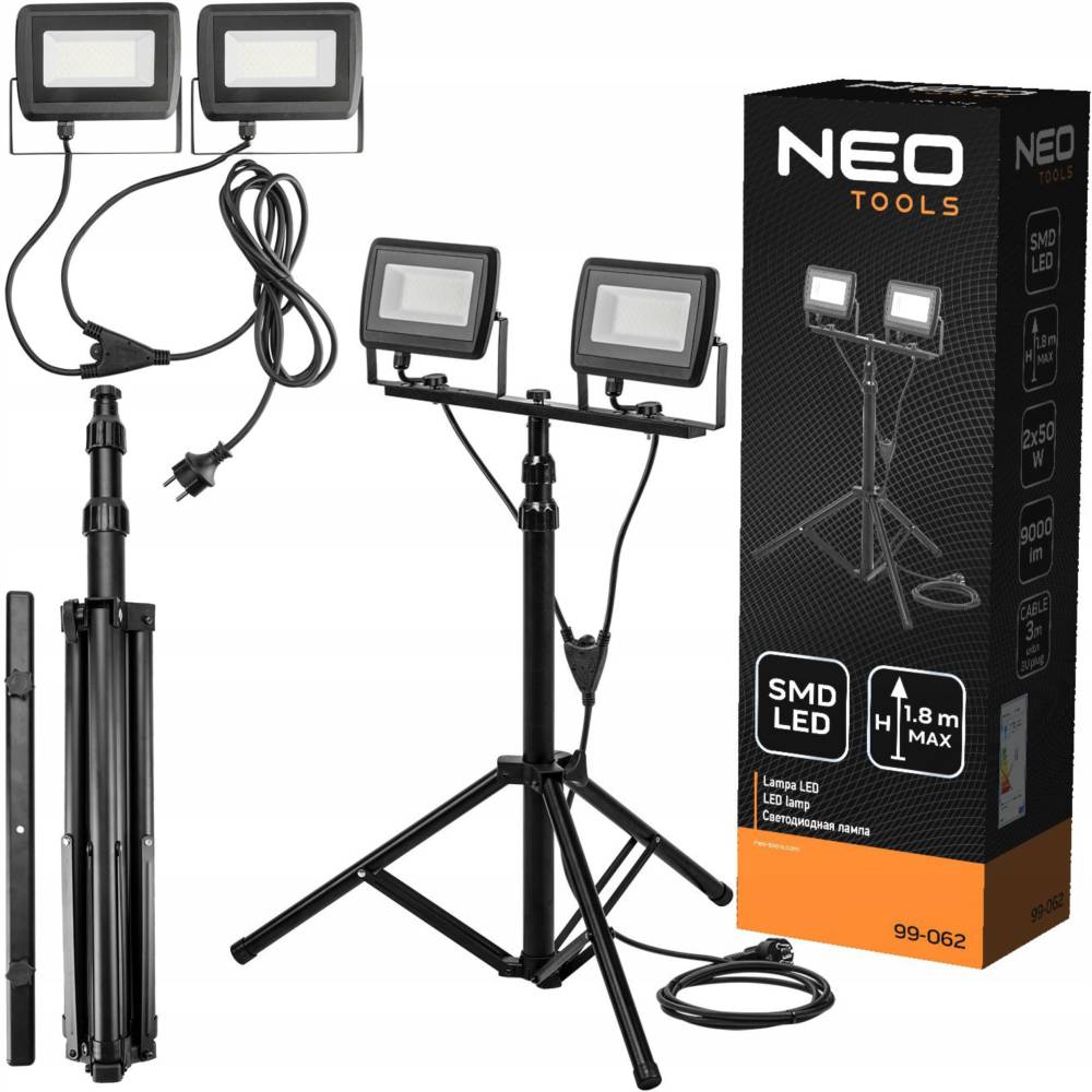 Neo Tools Прожектор, 220В, 8500лм, 2х50Вт, кабель 3м з вилкою, на штативі 1.8м, алюмінієвий, IP65 (99-062)