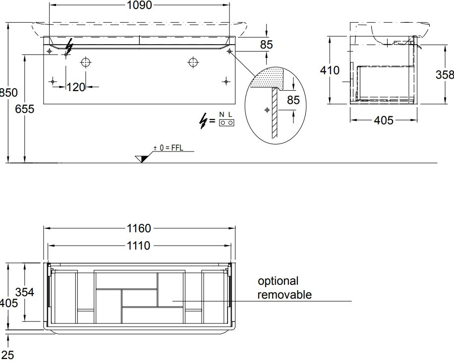 Розташування умивальника - по центру,