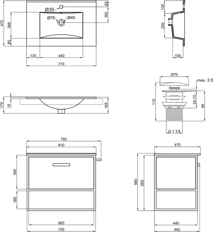 Розташування умивальника - по центру,