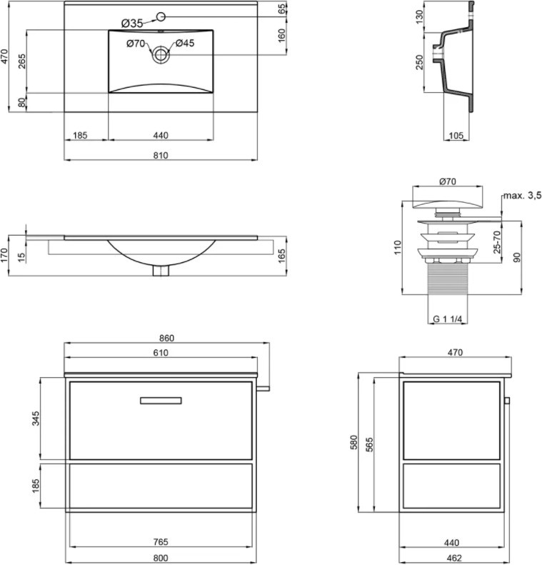Розташування умивальника - по центру,