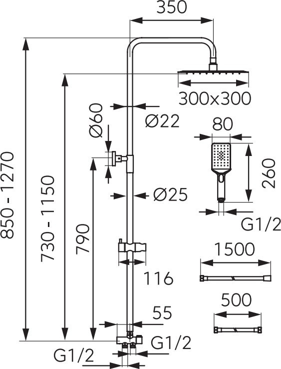 Розміри панелі/стійки - 850-1270x350 мм,