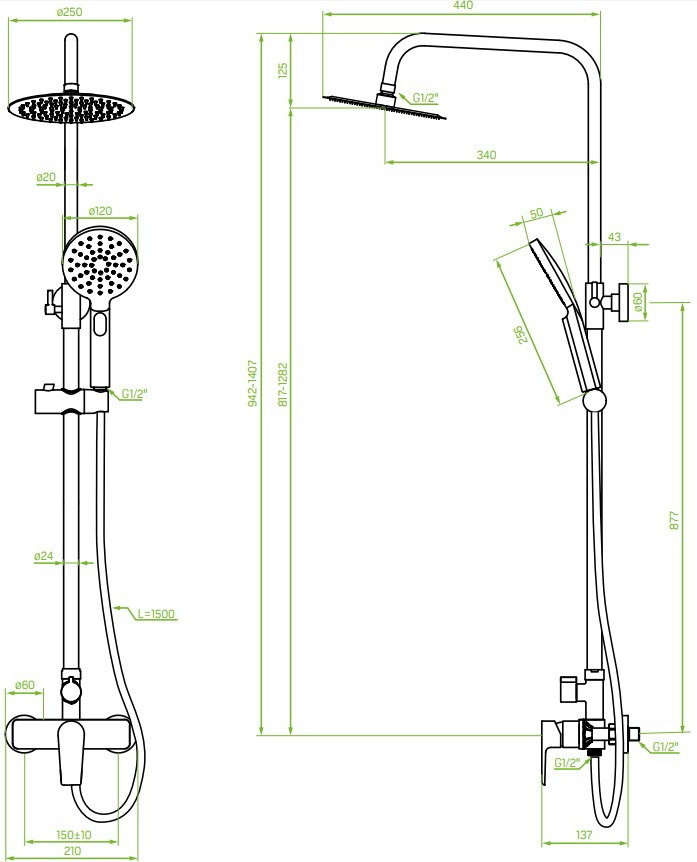 Довжина шланга (ручний душ) - 150 см,