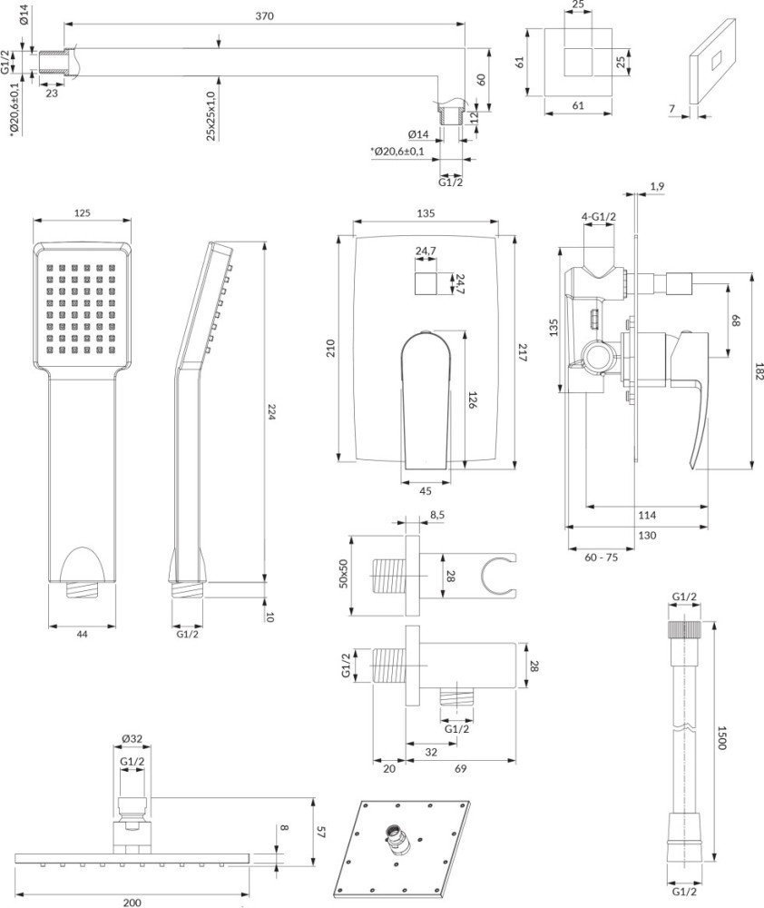 Розміри верхнього душу - 200 мм,