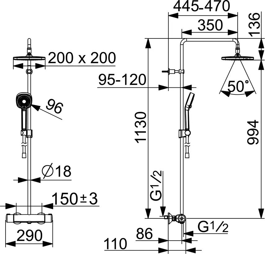 Кут нахилу (верхній душ) - 50 °,