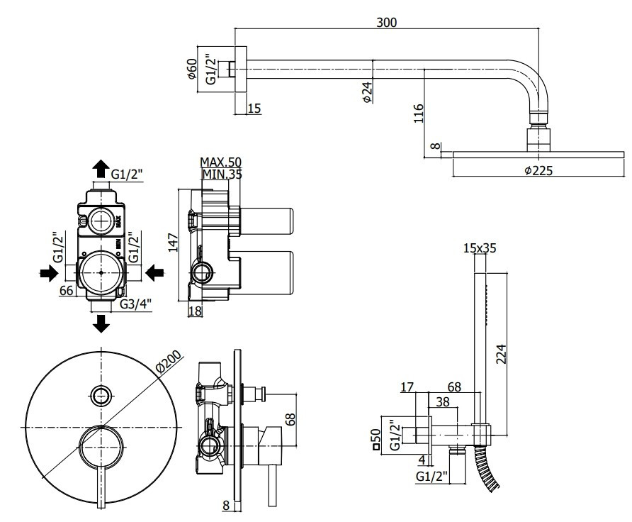 Розміри верхнього душу - 225 мм,