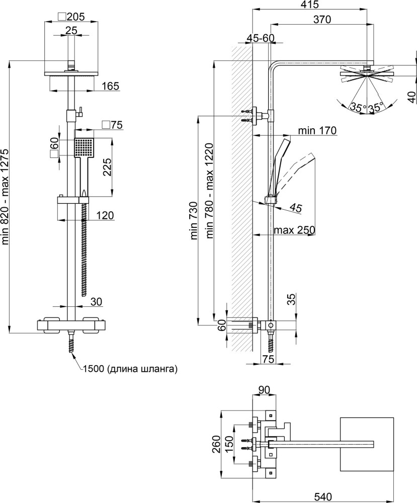 Кут нахилу (верхній душ) - 70 °,