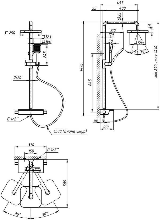 Розміри панелі/стійки - 890-1470x400 мм,