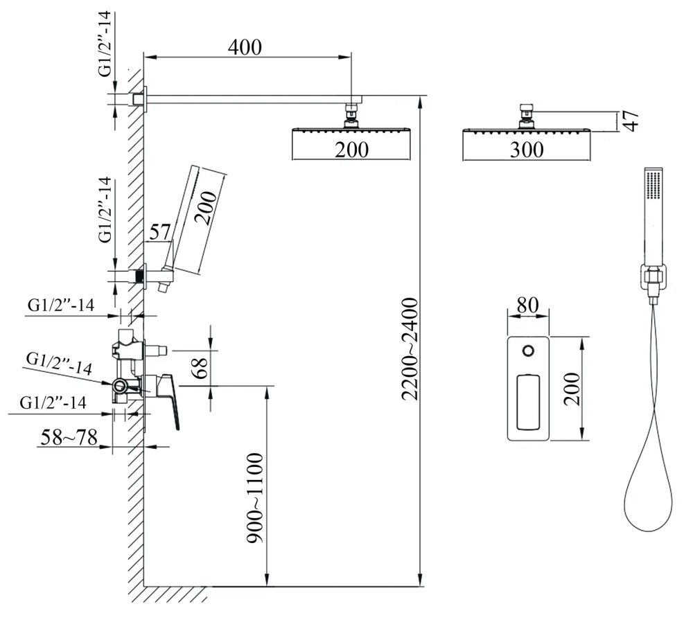 Розміри верхнього душу - 300 мм / 300x200 мм /,
