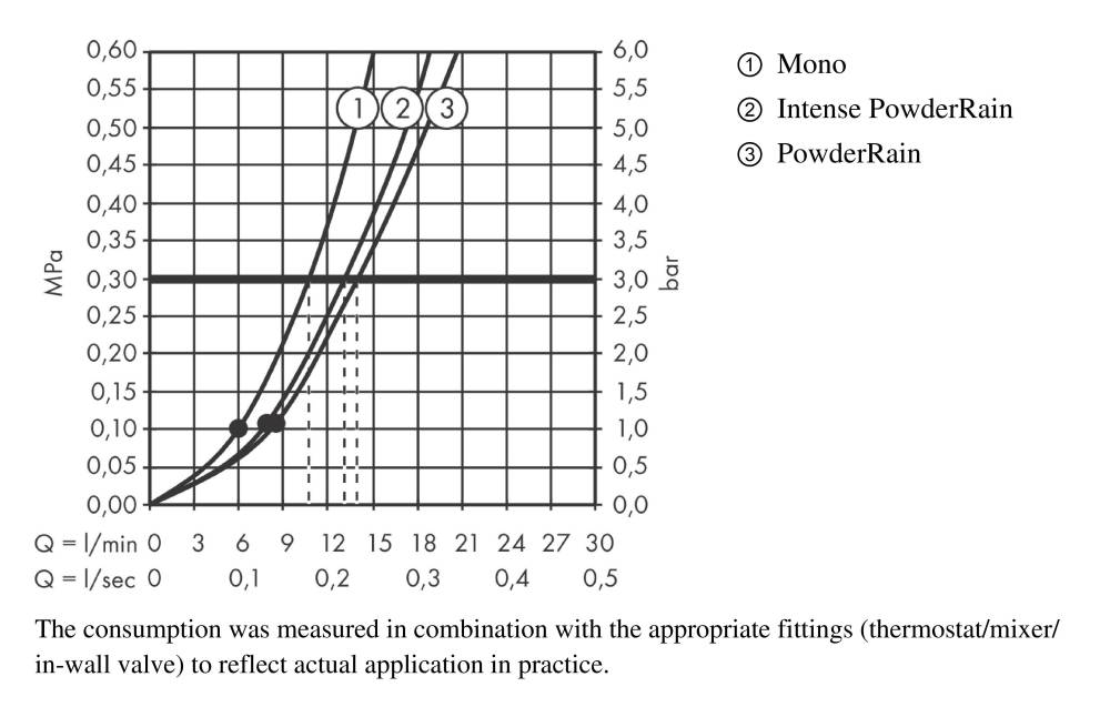 Витрата води (ручний душ) - 14 л/хв / максимальний, при тиску води 3 бар /,