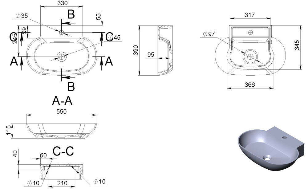 Діаметр отвору під змішувач - 35 мм,